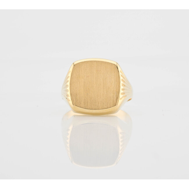 Het klassieke ontwerp wordt gekenmerkt door een strak, vierkant zegelvlak met een verfijnde matte afwerking, omlijst door subtiel gepolijste randen. De schouders van de ring zijn sierlijk vormgegeven en geven het geheel een tijdloze en robuuste uitstraling. Een karaktervolle ring die zowel modern als klassiek gedragen kan worden.