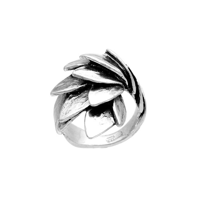 Een modern ontwerp met de schubben van een slang of zeedier of de veren van een vogel. De herhaling van vormen met een dynamische kwaliteit in een golvend patroon om leven in te blazen in deze fascinerende en omhullende ring.