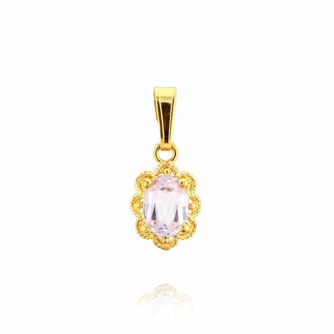 Deze vintage hanger is vervaardigd uit 14 karaat geelgoud en bezet met een ovaal geslepen synthetische kleursteen in een zachte lichtroze / lila tint. De steen is geplaatst in een sierlijke klassieke zetting met decoratieve gouden details rondom, wat het sieraad een verfijnde en elegante uitstraling geeft.